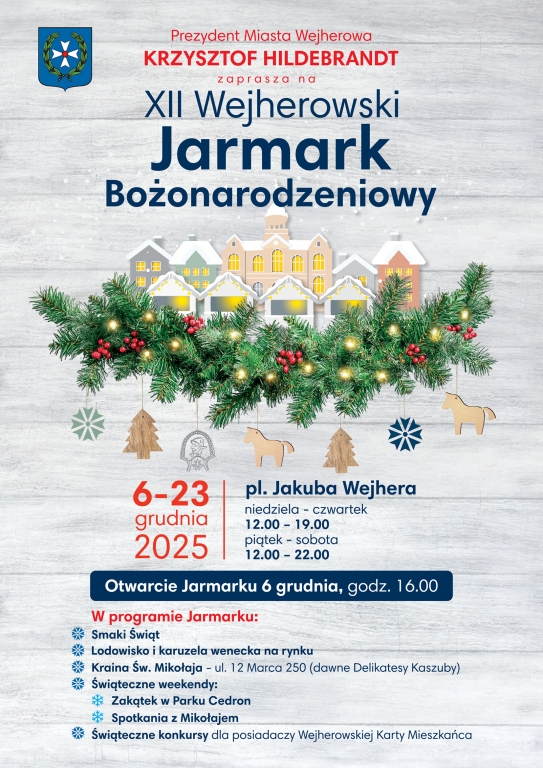 Zapraszamy na wyjątkowy, świąteczny czas pełen tradycji, aromatów i zimowej atmosfery! Już 6 grudnia rozpoczyna się w Wejherowie XII Jarmark Bożonarodzeniowy, który jak co roku wypełni miasto blaskiem lampek, muzyką i radosnymi spotkaniami. Jarmark Bożonarodzeniowy potrwa do 23 grudnia. Czynny jest od niedzieli do czwartku  w godz. 12 do 19, a w piątki i soboty do godz. 22.00