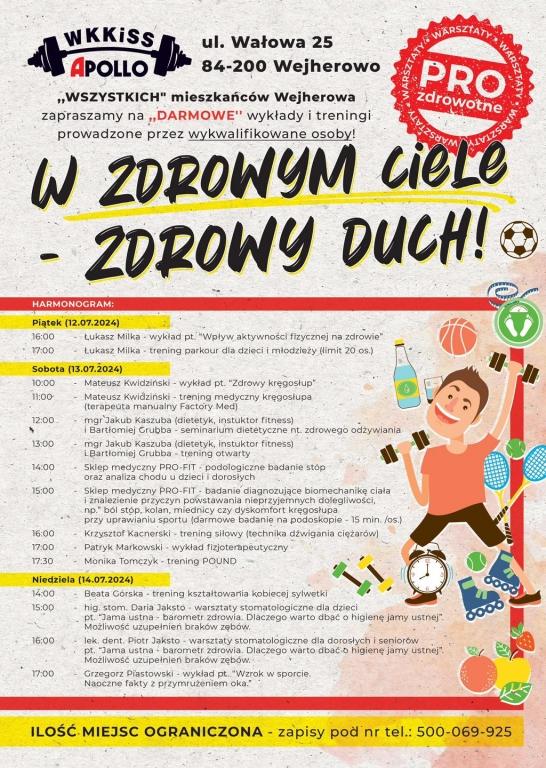 Wejherowski Klub Kulturystyczny i Sportów Siłowych "Apollo" zaprasza w najbliższy piątek, sobotę i niedzielę wszystkich mieszkańców Wejherowa na bezpłatne wykłady i treningi prozdrowotne. Warsztaty poprowadzą m.in. sportowcy, instruktorzy fitness, dietetycy, fizjoterapeuci, a t...