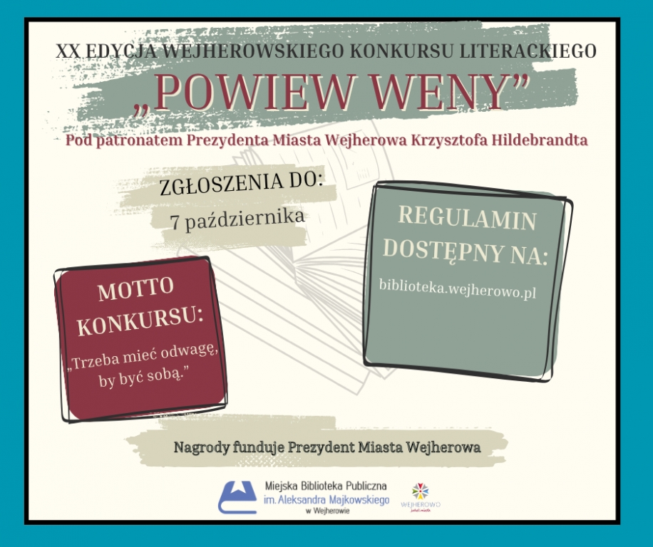 Zapraszamy do udziału w jubileuszowej, XX edycji Wejherowskiego Konkursu Literackiego „Powiew Weny” pod patronatem Prezydenta Miasta Wejherowa Krzysztofa Hildebrandta....
