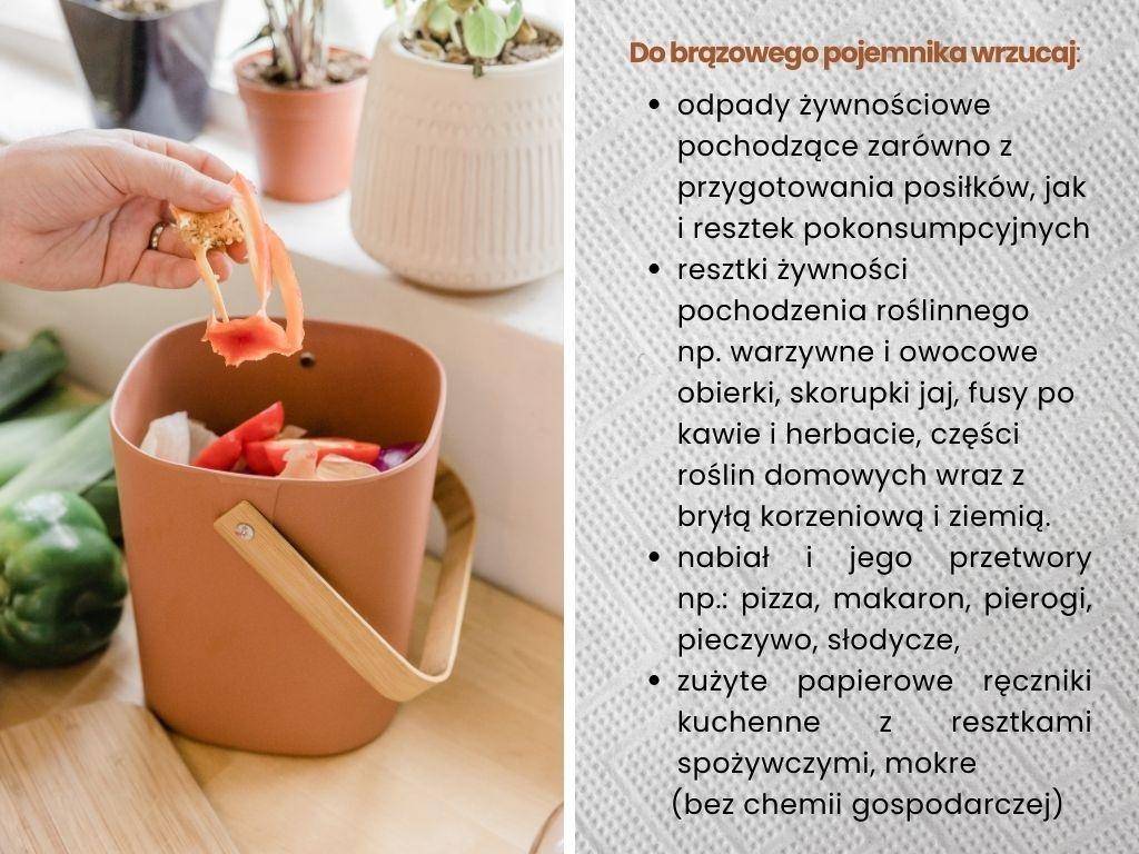 Bioodpady gromadzimy w woreczkach kompostowalnych a następnie umieszczamy w brązowym pojemniku.