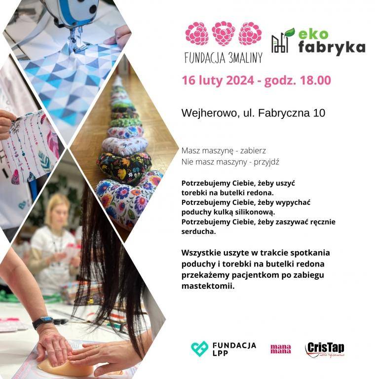 W Ekofabryce odbędzie się akcja pt. „Malinowy Piątek” podczas której powstaną niezbędne przedmioty dla kobiet po mastektomii. Zapraszamy 16 lutego br. o godz. 18.00 do Ekofabryki przy ul. Fabrycznej 10 w Wejherowie.