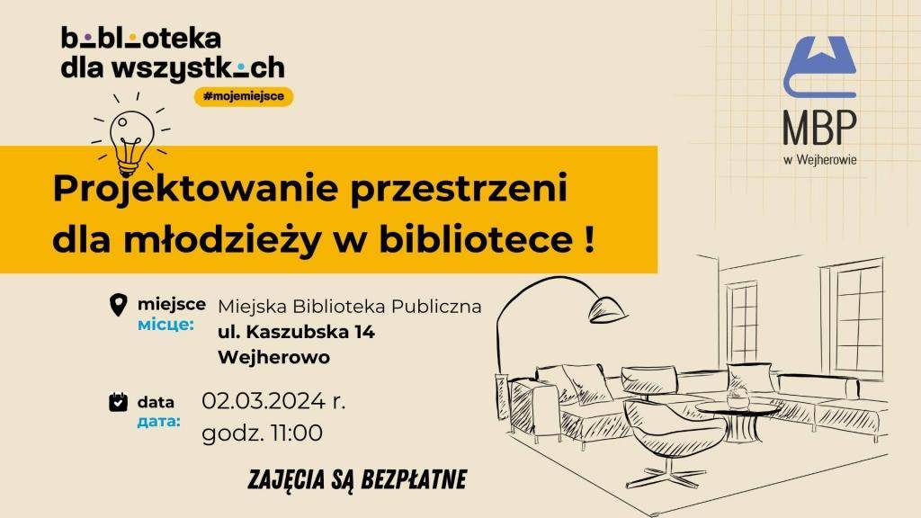 Zapraszamy nastolatków na kolejny etap projektowania przestrzeni. Spotkanie odbędzie się w sobotę, 2 marca br. o godz. 11.00 w Miejskiej Bibliotece Publicznej w Wejherowie. Zajęcia są bezpłatne.