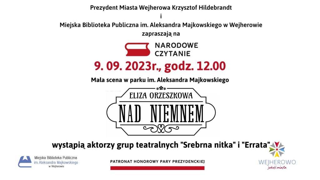 Prezydent Miasta Wejherowa Krzysztof Hildebrandt wraz z Miejską Biblioteką Publiczną, mają zaszczyt zaprosić na Narodowe Czytanie. Wydarzenie odbędzie się w Parku Majkowskiego na Małej Scenie, w sobotę 9 września br. o godz. 12.00.
