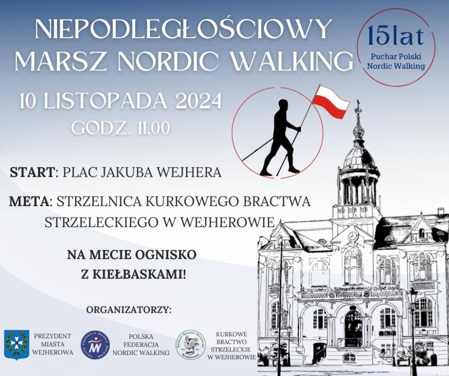 W niedzielę 10 listopada zapraszamy na Niepodległościowy Marsz Nordic Walking, który rozpocznie wspólna rozgrzewka na Placu Jakuba Wejhera. Trasa marszu poprowadzona ulicami miasta i leśnymi drogami, zakończy się ogniskiem na strzelnicy Kurkowego Bractwa Strzeleckiego w Wejherowie.
