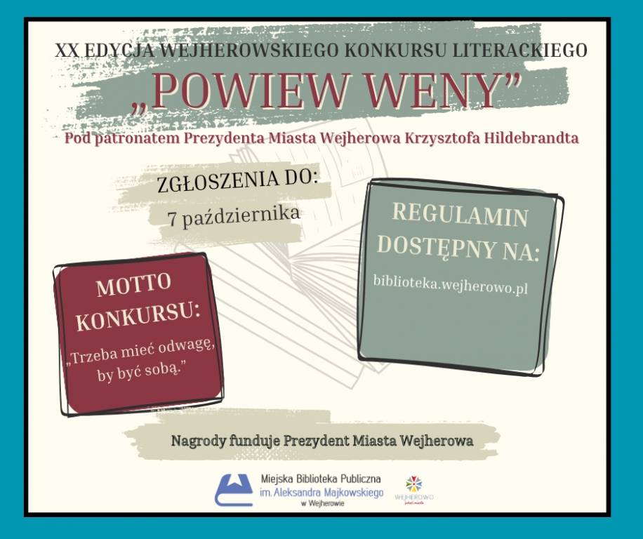 Zapraszamy do udziału w jubileuszowej, XX edycji Wejherowskiego Konkursu Literackiego „Powiew Weny” pod patronatem Prezydenta Miasta Wejherowa Krzysztofa Hildebrandta.