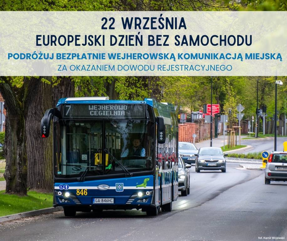 22 września obchodzimy Europejski Dzień bez Samochodu. Dlatego w najbliższy poniedziałek zostawmy swoje auta w garażu! Dzięki corocznej akcji organizowanej przez miasto i MZK Wejherowo w tym dniu, za okazaniem ważnego dowodu rejestracyjnego, będzie można bezpłatnie podróżować wejherowską komunikacją miejską.