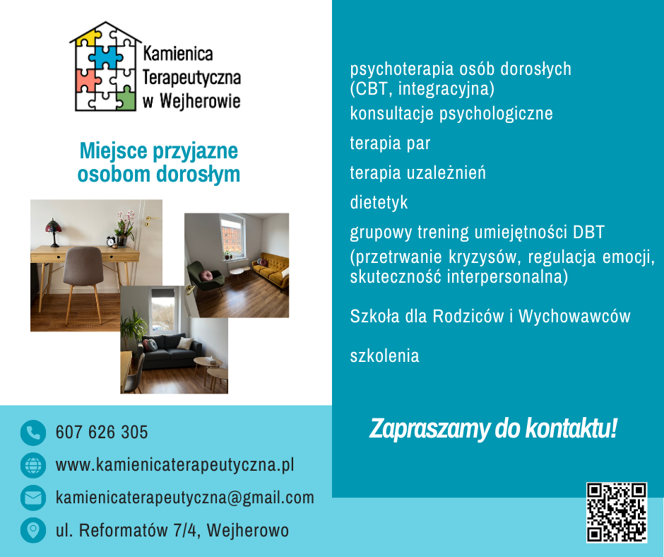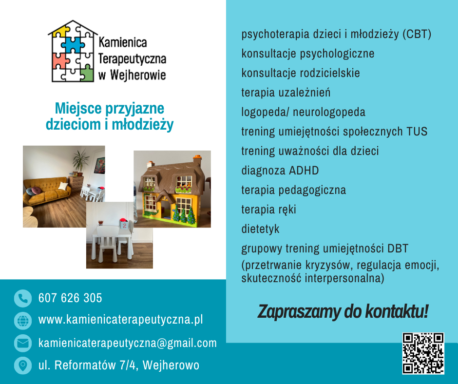 Kamienica Terapeutyczna w Wejherowie to przestrzeń, w której możesz liczyć na kompleksowe wsparcie zespołu doświadczonych specjalistów z zakresu zdrowia psychicznego. Tworzymy tu bezpieczną, życzliwą atmosferę, sprzyjającą rozwojowi i pozytywnym zmianom. To miejsce powstało również z myślą o psychoedukacji i wspieraniu rozwoju rodziców, nauczycieli, pracowników ochrony zdrowia, a także firm i organizacji.