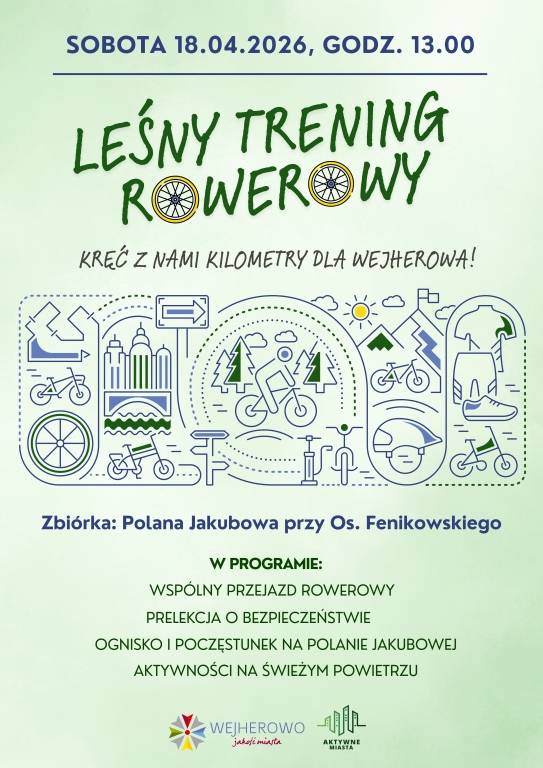 Kręć z nami kilometry dla Wejherowa! W sobotę, 18 kwietnia, zapraszamy mieszkańców w każdym wieku na Leśny Trening Rowerowy, którego celem jest zachęcenie do wzięcia udziału w akcji Aktywne Miasta.
